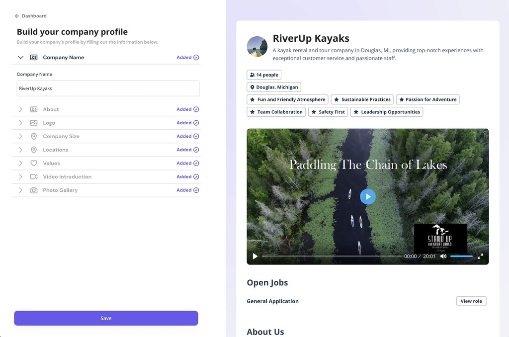 Easily craft a stylish company profile and AI-generated job posts, then get to know applicants through async video, audio and text.